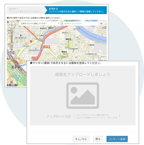 登録したコンテンツを発信して,公開します。制作したコンテンツは専用アプリを使って見ることができます。※一部の人にのみ公開することもできます。※専用アプリは無料です。